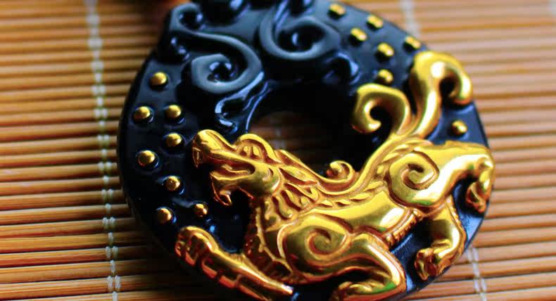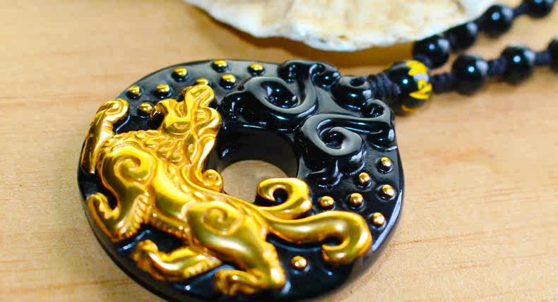 镀金貔貅吊坠男士 开光正品招财天然黑曜石转运圈金项链
