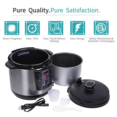 The Electric Pressure Cooker have a multi-functional nature, meeting your every cooking need. Time pre-setting and time selection functions make it super convenient for your cooking. Just pre-set the cooking time before sleeping, then you can get warm