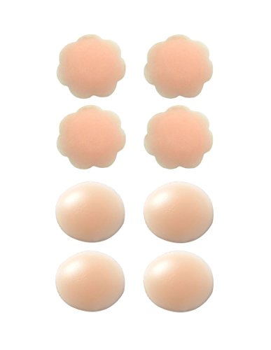 -. Feature : GREAT MATERIALS - These women invisible adhesive nipple covers are made from medical grade (hypo-allergenic Eco-friendly) silicone. Doubling protection of sensitive parts of a women / SUITABLE DIAMETER - The diameter (2.56 IN) of reusable adhesive nipple covers for a more secure coverage, you won't feel anything when wearing them. / COMFORTABLE & PORTABLE - The invisible silicone nipple covers designe to be small enough to fit in a handbag. Unique matte design allows you to wear more peace of mind / SELF-ADHESIVE & REUSABLE - The women Silicone Pasties are Waterproof and Washable, Perfect under t-shirts, sheer tops, dresses, and swimwear. We have improved our working and product quality to avoid the non-stick and shedding of nipple cover / PACKAGE INCLUDED - 4 Pairs invisible self adhesive nipple cover pasties (2 Pair Round + 2 Pair Flower).