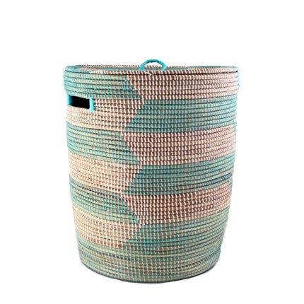 -. Binding : Kitchen -. Brand : Connected Fair Trade Products -. Feature : handmade by fair trade artisans / size: aprox 14" d x 19" t / lidded top, wipe clean, handles allow for easy portability / woven of plastic strips and millet grass / may have slight variations in design and size as this is a one-of-a-kind handmade product -. Label : Connected Fair Trade -. Manufacturer : Connected Fair Trade -. ProductGroup : Home -. ProductTypeName : HOME -. Publisher : Connected Fair Trade -. Studio : Connected Fair Trade -. Title : Flat Lid Storage Hamper - Aqua Herringbone