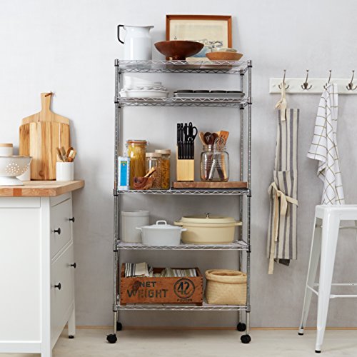 - Feature : 5-shelf shelving unit on wheels for your kitchen, office, garage, and more / Each shelf holds up to 350 pounds (evenly distributed) / Wire shelves adjustable in 1-inch increments; no tools required / Durable steel construction with chrome finish; adjustable leveling feet / Measures 30 by 14 by 60 inches (W x D x H); 61.5 inches high on wheels