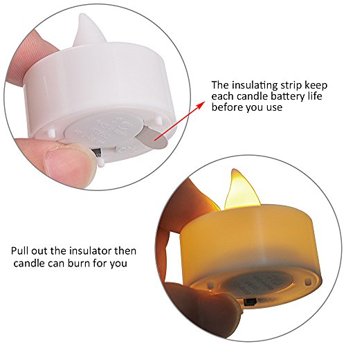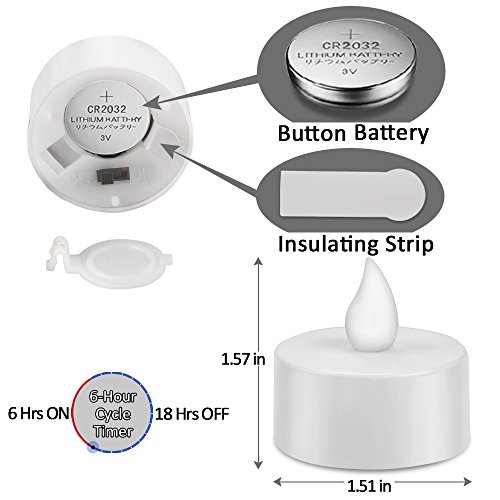 LONGER BATTERY LIFE: Each Battery Operated tea lights prowered by one CR2032(Included), 200+ hours battery life, can light up 15+ days! Each candle use the insulating strip to keep battery life before you use.And the CR2032 is Easy to Replace.