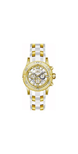 Invicta 24164 Pro Diver chronograph men's dive watch features a 50mm wide and 19mm thick yellow gold plated solid stainless steel case with a unidirectional rotating bezel and textured push-pull crown with function pushers. Invicta 24164 is powered by an accurate Japanese TMI VD53 quartz chronograph movement. This stylish watch also features a textured white glass fiber dial with white accents gold tone luminous skeleton hands and hour markers along with the chronograph, 12/24-hour time and date display functions, scratch resistant flame fusion crystal and water resistant to 200 meters. Invicta 24164 is equipped with a 26mm wide yellow gold plated solid stainless steel and white polyurethane rubber strap with a buckle clasp. Invicta 24164 men's Pro Diver white glass fiber dial chrono watch is brand new and comes in an original Invicta gift box and is backed by a 5 year limited warranty.Feature