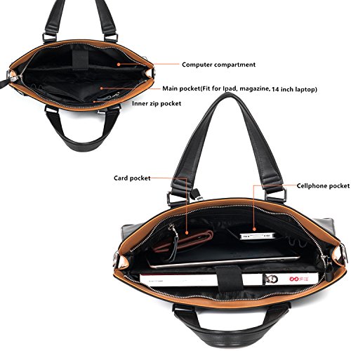 -. Feature : [Material /Fabric]: Second layer of cowhide leather(Genuine products. 100% brand new, original and high quality) with polyester lining. / [Hardware & Closure & Color] : High quality silver hardware. Zip closure. Black. 1 color for your needs. Use it as casual bag, travel bag, laptop bag or business bag as well. Perfect for every day use, work or travel. / [Structure]:1 main pocket, perfect for your Laptop, 14inch, mobile phone, magazine(210*285mm), A4 file(210mm×297mm), umbrella and other daily things. 1 inner zipper pocket, 1 Iphone 6s pocket, 1 card slots, 1 computer compartment, 1 back pocket. It is convenient & comfortable to wear in 3 ways, tote, shoulder, cross body. / [Dimension]:14.57(L)*2.76(W)*11.02(H)(in). One size for your needs. Please allow 0.3"-0.9" in size error due to manual measurement. / [Features]:Fashion, practical and light-weight. The style is fashionable with nice structure and the color is trendy which can be matched with many different clothes. And there is something new, and brown color design, which makes the bag looks so fashion and not too formal nor too casual either. Wherever the handles or strap, it is durable and comfortable. Hope this bag could be your loyal friend keeping company with you for every adventure both near and far.