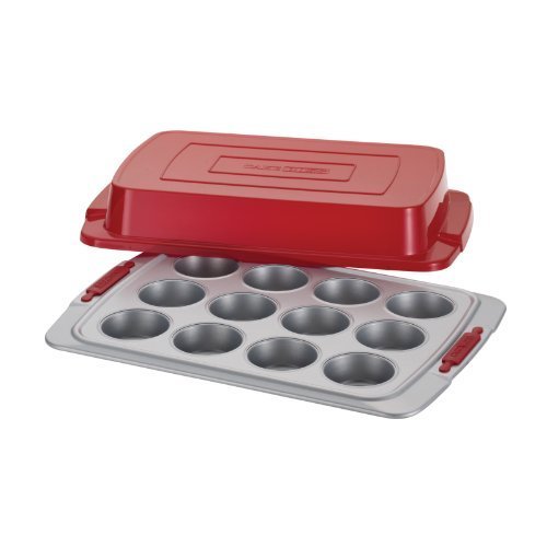 -. Title : Cake Boss Deluxe Nonstick Bakeware 12-Cup Covered Muffin Pan, Gray with Red Silicone Grips by Meyer