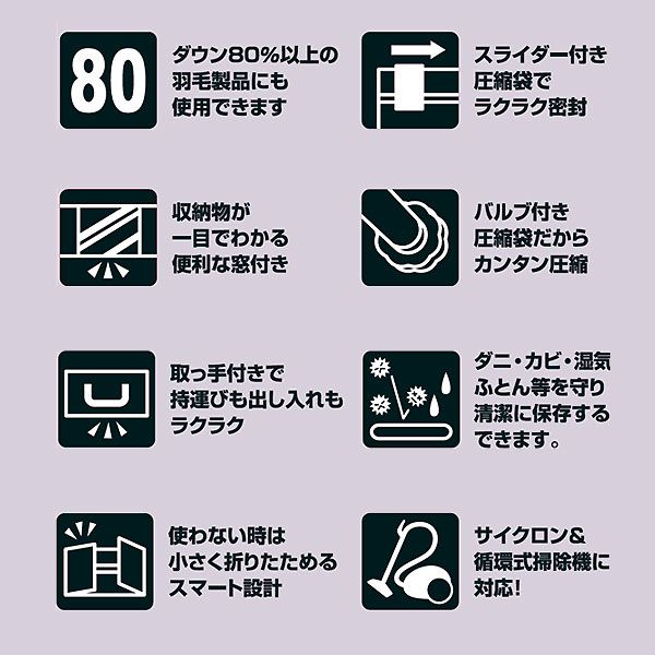 布団・毛布・枕が全部入る、 圧縮袋と収納ケースが一体になった布団用収納袋 【圧縮袋+収納ケース】ふとん一式用(100×70×20cm) 寝具をまるごと大型サイズ! ●まくら ●毛布 ●掛け布団(4折り) ●敷布団(3折り) をまとめてキレイに収納できます。 ダウン80%以上の羽毛製品にも使用できます。 スライダー付圧縮袋でラクラク密封。 取っ手付きで、持ち運び、出し入れラクラク。 ダニ・カビ・湿気からふとん等を守り、清潔に保存。 サイクロン&循環式掃除機にも対応! <仕様> ふとん一式用:幅100cm×奥行70cm×高さ20cm (袋サイズ 幅150cm×高さ90cm×マチ40cm) 素材・材質 ナイロン,ポリエチレン,シリコンゴム,ポリプロピレン,PVC セット内容 収納ケース×1,圧縮袋×1< その他圧縮袋・一緒に使える防ダニシート >