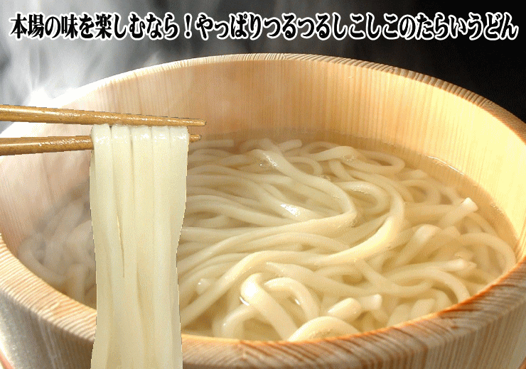 | 調理方法 | 多目のお湯でうどんを茹でた後、流水でもみ洗いをして表面のぬめり、塩分を 取り除き、器に盛ります。 |