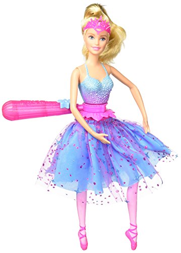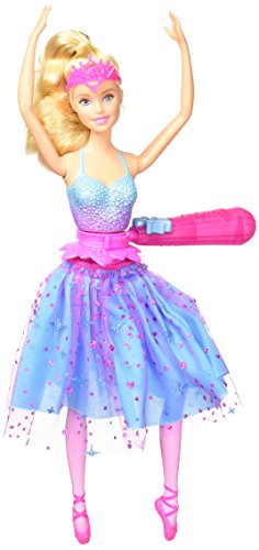 Dance the day away with this Barbie twirling ballerina doll that brings performance and possibilities to life! Girls control the choreography, choosing when the beautiful prima ballerina spins. Simple and magical, the mechanism is easy to work. Clip the pink wand, adorned with a fairytale icon, to the waist of the doll, and press down -- Barbie doll bends into a classic plie, and her body spins gracefully, causing her skirt to float and flow. Designed with a layer of blue and a sheer pink overlay with blue glittery sparkles, the effect is show-stopping! A sparkling blue and pink ombre bodice and pink toe shoes complete the gorgeous look. A removable tiara lets girls take this dancer from rehearsal to performance, from princess to prima ballerina and everywhere in between because with Barbie, anything is possible! Includes doll wearing fashion (non-removable), tiara and twirl-activating wand.Feature