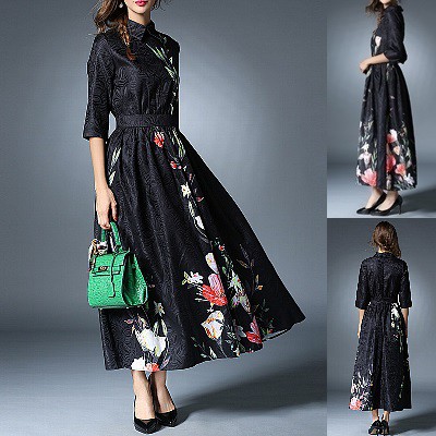 ワンピース ロング丈 パーティードレス ブラック 花柄 襟付き シャツ エレガント きちんと感 大人 上品 デート お呼ばれ drgz2322