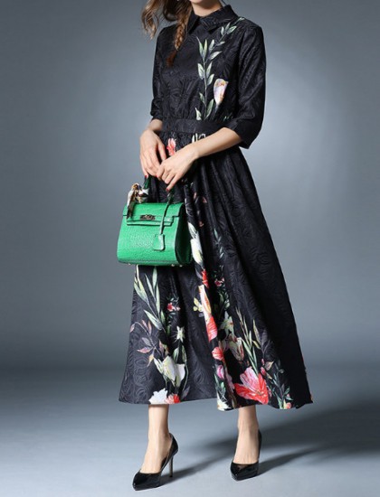 エレガントな、襟付き花柄ロング丈ワンピース。