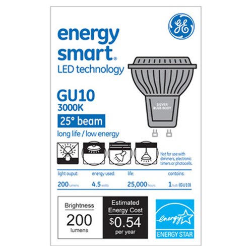 -. Binding : Tools & Home Improvement -. Brand : GE Lighting -. Color : Warm White -. EAN : 0043168648875 -. Feature : MR16 shape with GU10 base for use directional fixtures such as recessed can lighting / 20-watt replacement uses only 4.5-watts / Input Voltage = 120 volts / Provides 200 lumens / Lasts 22.8 years based on 3 hours per day usage -. Label : GE Lighting -. Manufacturer : GE Lighting -. Model : 64887 -. MPN : 64887 -. NumberOfItems : 1 -. PackageQuantity : 1 -. PartNumber : 64887 -. ProductGroup : Home Improvement -. ProductTypeName : LIGHT_SOURCE -. Publisher : GE Lighting -. Size : 200-Lumen -. Studio : GE Lighting -. Title : GE Lighting 64887 Energy Smart LED 4.5-Watt (20-watt replacement) 200-Lumen MR16 Floodlight Bulb with GU10 Base, 1-Pack -. UPC : 043168648875