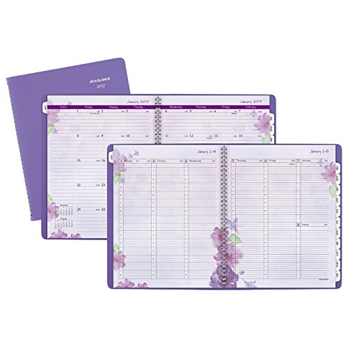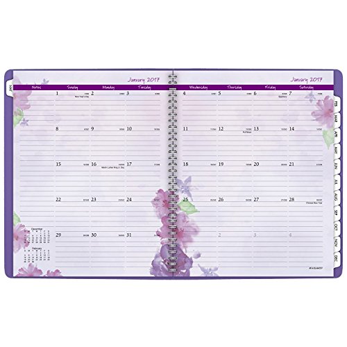 -. Feature : Weekly / Monthly premium professional appointment book with a stylish watercolor floral design on each page. 13 month date range (January - January) with tabbed pages to facilitate turning to the current month. / One week per two page spread is lined with appointment times from 7:00 a.m. - 8:00 p.m. Mon - Fri for detailed weekly scheduling. Julian dates. Weekly pages display Monday - Wednesday on left page and Thursday - Sunday on right page. / One month per two page spread with ruled blocks helps you neatly plan events. Past and future month calendar blocks for reference included on monthly pages. / Special pages include holiday listing, past, present and future year reference calendars, event calendar, contacts and notes. Each quarter of the year is designated by one of four beautiful colors. / One-piece suede-feel cover in lavender is durable and stylish. Appointment book is wirebound. Premium paper resists ink bleed* and contains a minimum of 30% post-consumer recycled material. 8.5 in. x 11 in. pages. 9.25 in. x 11.13 in. x .56 in. overall book size.