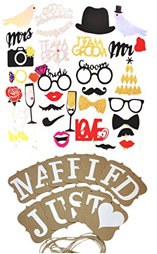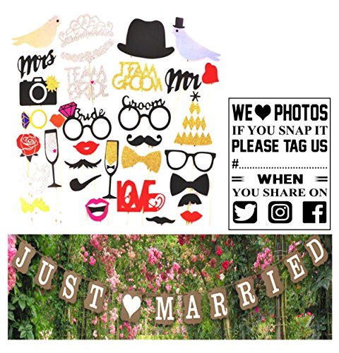 Wedding Photo Booth Props with Just Married Banner and Hashtag # Social Media Sign for Sharing Photos - 34 Printed Pieces with Wooden Sticks for Selfies at Your Event