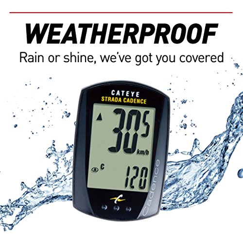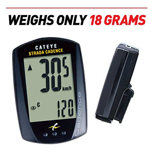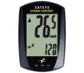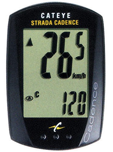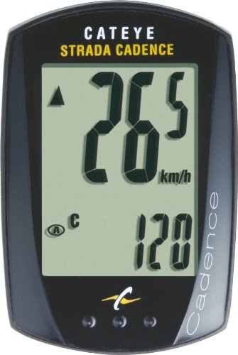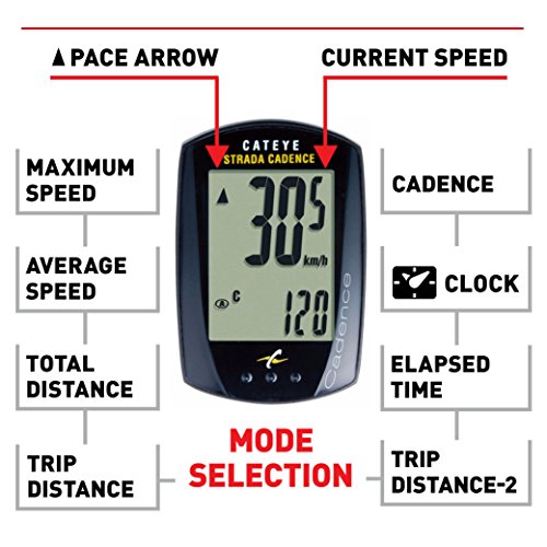 Amazon.com The Strada Cadence bicycle computer from CatEye is notable for its oversized screen and large numbers. Featuring the company's trademark ClickTec interface, the device enables you to switch among eight modes by simply pressing the bottom of the computer face. Your selected mode (cadence, average speed, et cetera) appears at the bottom of the screen, while your current speed always appears at the top in huge, easy-to-read digits. An up/down arrow tells you whether you're above or below your average speed. An innovative FlexTight bracket mounts quickly, securely, and without tools to virtually any handlebar or stem. The new tool-free speed and cadence sensor mounts effortlessly to any standard (non-elevated) chain stay. The device includes a clock and a programmable odometer and lets you track your current speed, maximum speed, average speed, trip distance, and elapsed time. Other features include automatic start/stop and an automatic power-saving mode. Specifications: - Handlebar mount size: 22 mm to 32 mm