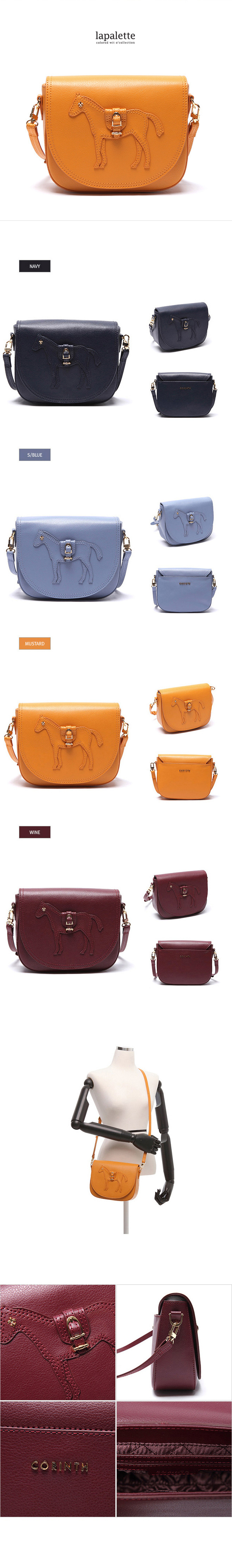 2016 S/S, premium line ‘CORINTH’ in CUPCAKE by lapalette’s introduces ‘TAYLOR LINE’ featuring the streamlined design. Round flap on the slightly square shaped body accentuates the classic feminine design. Crafted With soft touch cow leather, this bag is in lush look, and highly durable. Brand signature-CORINTH horse patch-adds a unique vibe. With spacious inside room and a back slip pocket, this mini crossbody bag is small in size, but practical in use. The simple feminine style is perfect to be matched with versatile outfits from casual to formal. |