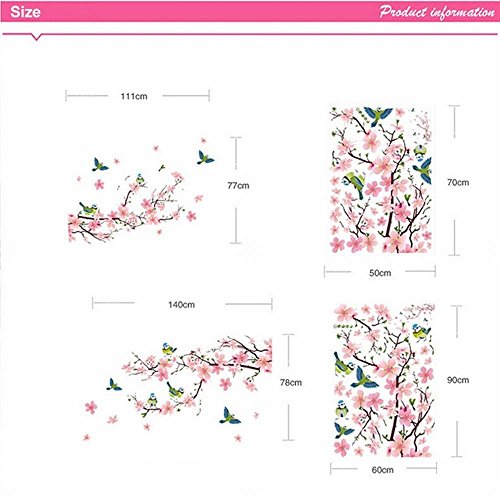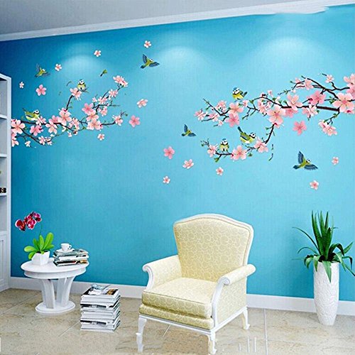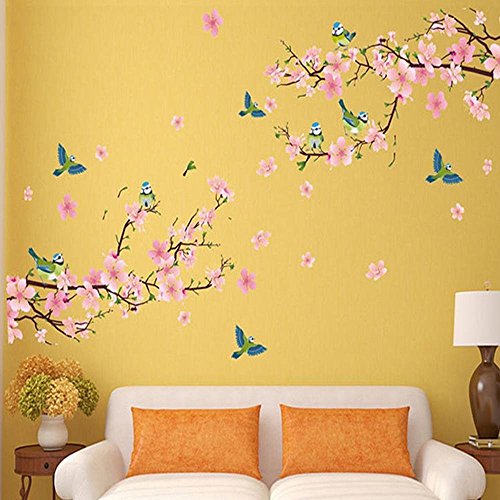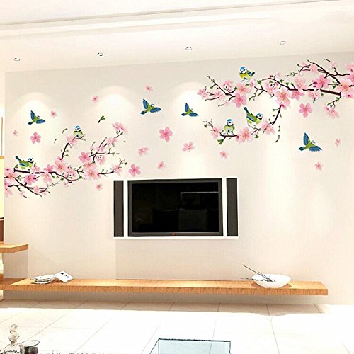 FEATURES & PATTERN: Bird and Flower Design Country Style TV Background Wall Sticker, Pink Cherry Blossom Wall Decals. Features: High Definition Art Work, Cololr Fast, Environmental Friendly Materials