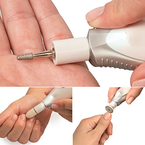 Includes 7 interchangeable sapphire-coated attachments that effectively smooth corns and calluses, remove excess cuticles, and file, shape and buff nails