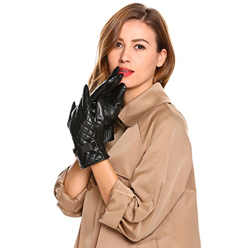 Features 1) Our premium lambskin leather provides an extraordinarily smooth feeling. 2) Soft, comfy and warm fleece is lined to let you keep warm. 3) Precision touch point control, screens respond to all activity while wearing the gloves. 4) Keep you warm in the cold winter and keep your fingers free to do anything. 5) Thick enough to keep your hands warm, yet thin to tuck in your coat pocket or purse with no problems. 6) Simple fashion style; Great to match your favorite outfit. 7) Perfect for running, cycling, hiking, driving and outdoor sports activities. 8) The gloves will make a best gift to your wife, daughter, mom, girlfriends, etc.