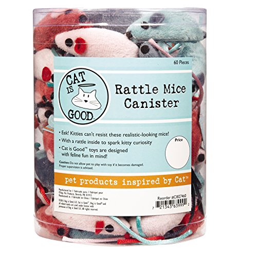 -. Binding : Misc. -. Brand : Cat Is Good -. Color : clear -. EAN : 0721343639992 -. Feature : Our bestselling stuffing-free toys are now available for cats! / Savvy Tabby (SAVVL) Catnip Farm Unstuffies Clip Strip of 12 toys includes 3 of each fun / Made in China -. Label : Cat Is Good -. Manufacturer : Cat Is Good -. Model : CI8274 60 -. MPN : CI8274 60 -. PackageQuantity : 1 -. PartNumber : CI8274 60 -. ProductGroup : Pet Products -. ProductTypeName : PET_SUPPLIES -. Publisher : Cat Is Good -. Studio : Cat Is Good -. Title : Cat Is Good 60-Piece Rattle Mice Canisters -. UPC : 721343639992
