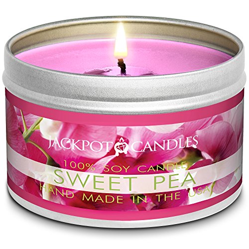 Studio : Jackpot Candles Publisher : Jackpot Candles Binding : Kitchen Product Description Fill your home with the scents of springtime when you light this Sweet Pea jewelry candle travel tin with a jewelry surprise size ring inside! The delicate, mellow perfume of Sweet Pea flowers mixed with undertones of fresh berries will transform any room into a sun filled garden no matter where you roam, even if it's far from home. 0