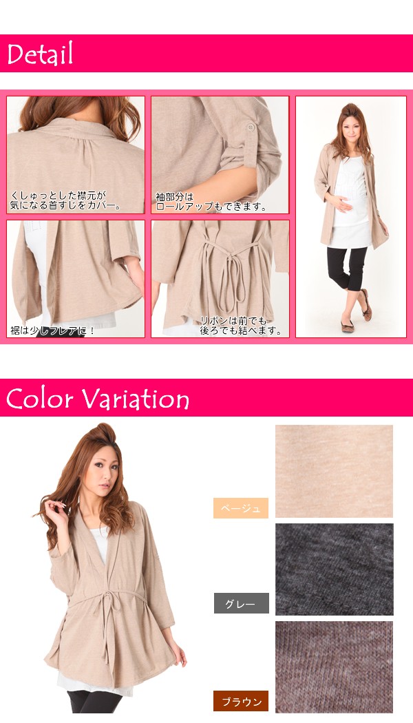 首から流れるような襟元が大人っぽいカーディガン。さらっと羽織るだけですっきりしたスタイルに。お尻が隠れる丈も、魅力的。袖のロールアップもでき、ウエストリボンは前後どちらでもOK。