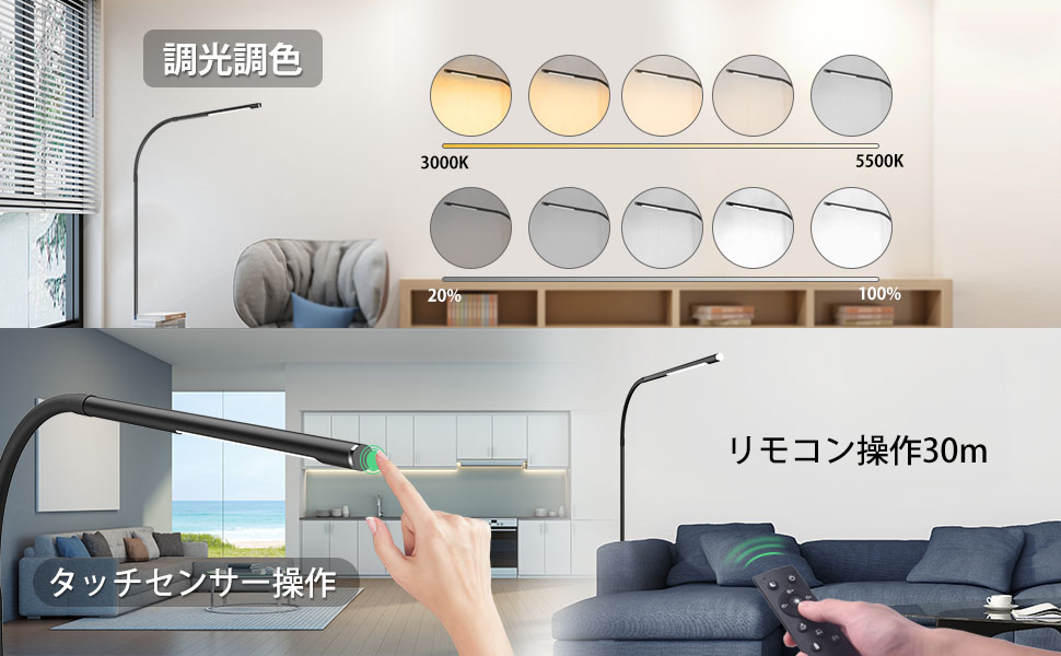 リモコン機能:リモコンでご好きなモードを選択してくださいね。弊社のフロアスタンドは6種類モードがあります。そして、モードによって色温度も違います。固定のモードに色温度と明るさの調整も制限ない。リモコンで調光調色が可能です。