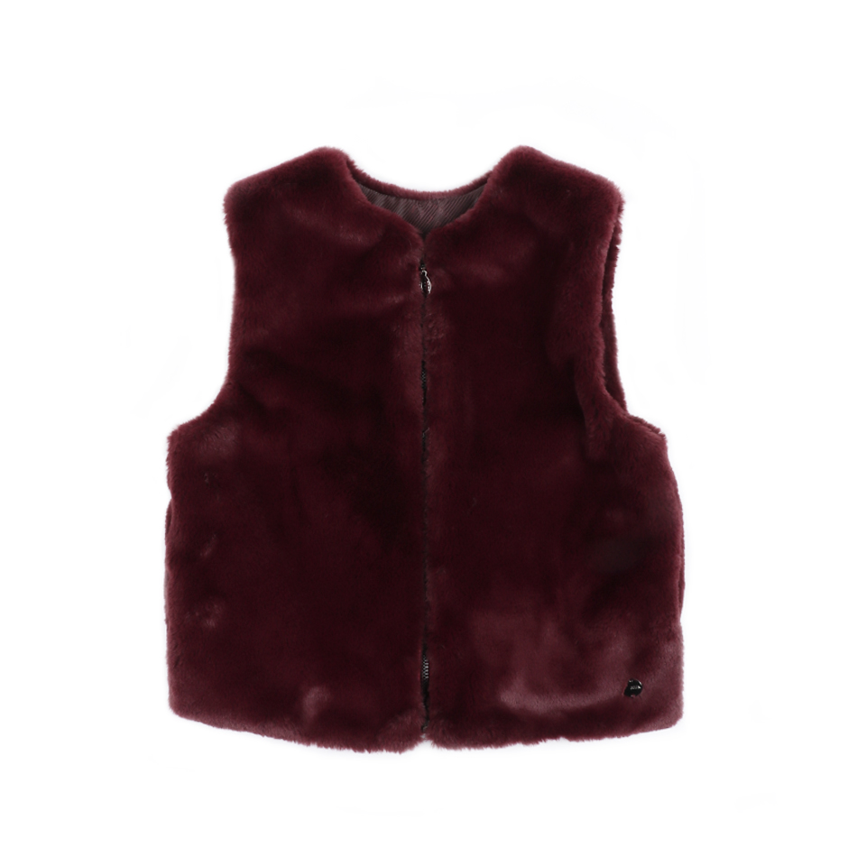 세련된 와인 컬러의 이미테이션 퍼 베스트 아이템입니다.