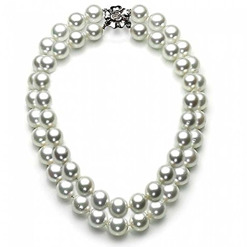 This double strand necklace is a great 12mm pearl gift for a bride-to-be or nautical styled girl in your life. With a crystal clad clasp this 16in necklace is anything but boring, the elegant Simulated simulated pearls are a mix of fun and elegance.