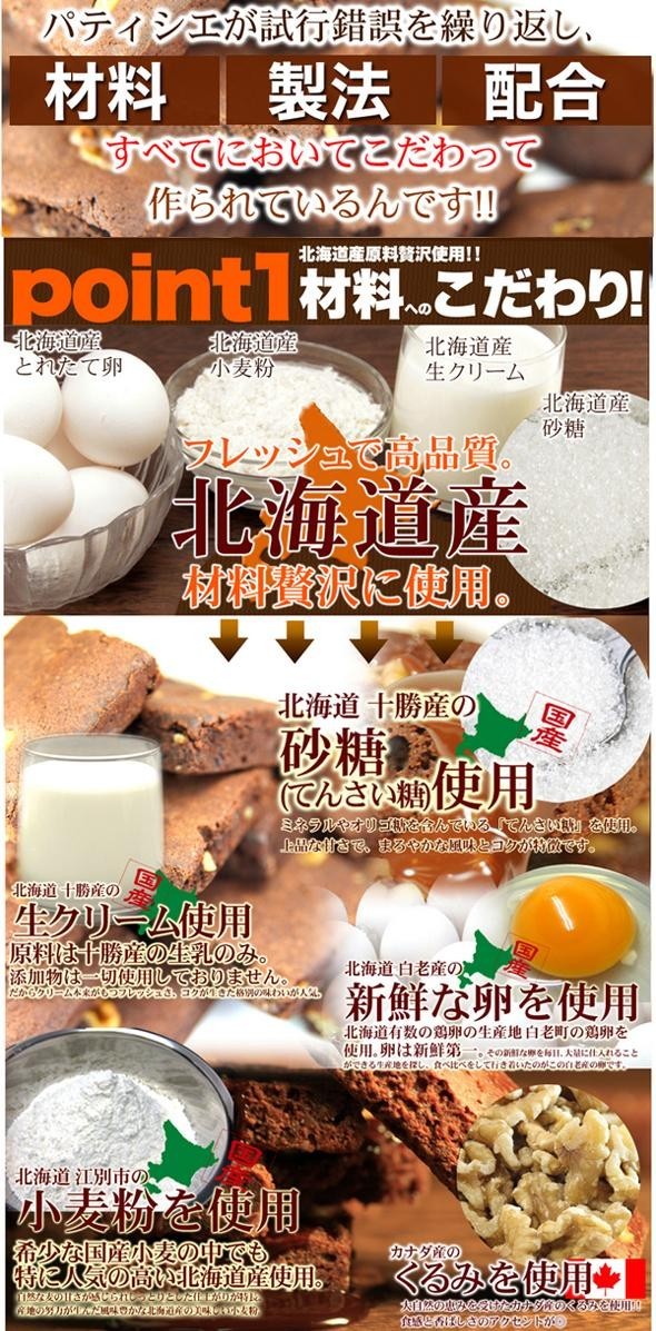 | 原材料 | チョコレート、砂糖、卵、小麦粉、マーガリン、くるみ、ショートニング、ココアパウダー、バター、生クリーム、ラム酒、バニラエッセンス、乳化剤、香料、酸化防止剤(V.E.)アナトー色素(原材料の一部に乳、大豆を含む) |