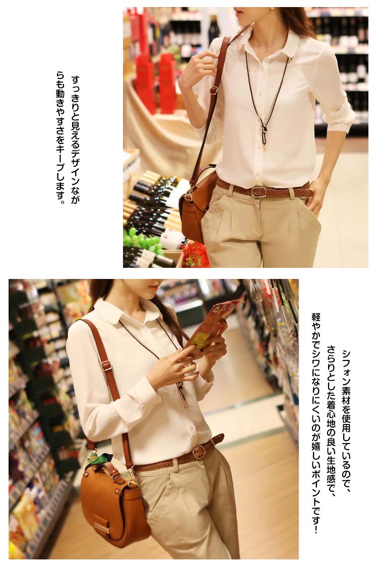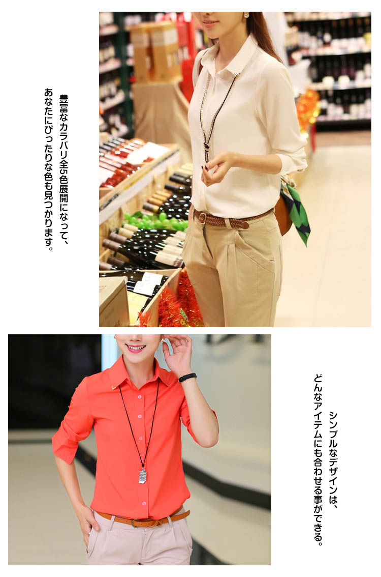 | 柔らかなシフォン素材が上品な印象に大人可愛いシフォンブラウスの登場です。シフォン素材を使用しているので、さらりとした着心地の良い生地感で、軽やかでシワになりにくいのが嬉しいポイントです!すっきりと見えるデザインながらも動きやすさをキープします。豊冨なカラバリ全5色展開になって、あなたにぴったりな色も見つかります。シンプルなデザインは、どんなアイテムにも合わせる事ができる。普段使いはもちろん、フォーマルなシーンでも大活躍の優秀アイテムです! | |
