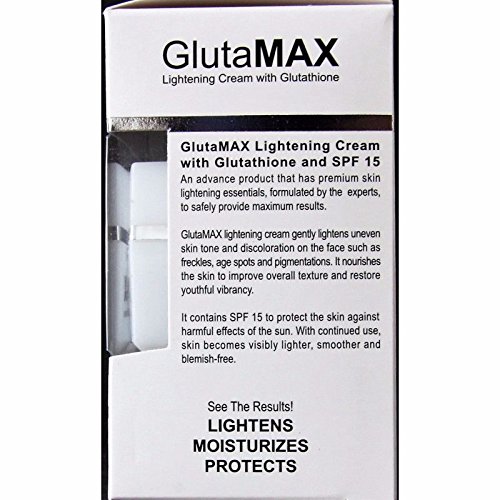 -. Binding : Misc. -. Brand : GlutaMax -. EAN : 5054515473229 -. Feature : An advanced product containing skin whitening essentials. / Formulated by experts to safely provide maximum results. / Gently lightens uneven skin tone and discoloration on the face such as freckles, age spots, and pigmentation. / Nourishes the skin to improve overall texture and restore youthful vibrancy. / Contains SPF 15 to protect the skin against harmful effects of the sun. -. IsAdultProduct : 0 -. Label : GlutaMAX -. Manufacturer : GlutaMAX -. Model : Lightening Cream with Glutathione -. MPN : Lightening Cream with SPF 15 -. PackageQuantity : 1 -. PartNumber : Lightening Cream with SPF 15 -. ProductGroup : Beauty -. ProductTypeName : BEAUTY -. Publisher : GlutaMAX -. Studio : GlutaMAX -. Title : Glutamax Lightening Cream with Glutathione and SPF 15 - 30gm