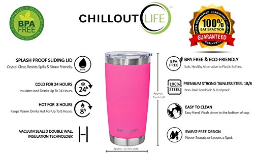 -. Feature : #1 DOUBLE WALL VACUUM INSULATED TECHNOLOGY - high tech insulation methods prevent heat transfer to the outer walls of the tumbler, keeping your cold drinks ice-cold for up to 24 hours and your hot drinks scalding-hot for up to 8 hours. Our cups use a SWEAT FREE DESIGN that prevents any temperature changes or condensation from forming on the outside, making sure that this cup never leaves a spot. Never use a coaster or burn yourself again! / #1 PREMIUM QUALITY - the ChillOut Life Tumbler is made from the highest quality, premium 304 18/8 food grade stainless steel, which is unbreakable, electro polished on the inside to ensure your cups remain rust-free, and super grip colored finish on the outside. / #1 EASY TO CLEAN - The large, wide mouth opening allows easy access to the stainless steel surface, eliminating hard to reach spots and helping you keep every inch washed - Hand wash only. / #1 BPA FREE & ECO-FRIENDLY - This makes a safe, green, flavor free and healthier alternative to plastic bottles and cups. Save money on disposable cups that won't keep your liquids hot or cold by buying this cup that lasts a lifetime. Fill your tumbler with coffee, sweet tea, beer, ice water, milkshakes, lemonade, soda and more! / ★★★100% SATISFACTION GUARANTEED★★★ or your money back, no questions asked! There is no risk when purchasing this PREMIUM QUALITY tumbler.