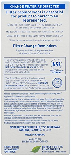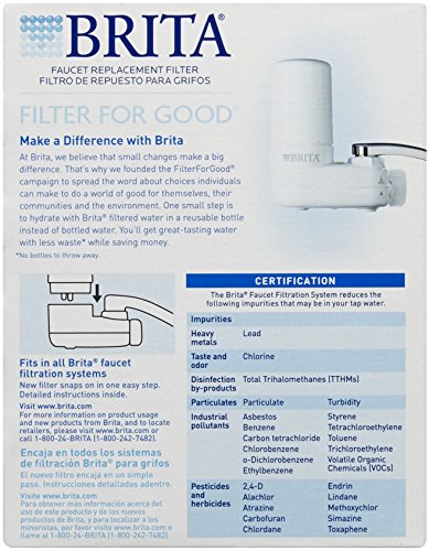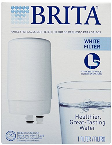 Keep cleaner*, great-tasting water on tap for drinking and cooking. Easy-to-install Brita Faucet Replacement Water Filters fit all Brita Faucet Water Filter Systems. One filter can replace 750 standard 16 ounce water bottles, saving you money and reducing waste. Each filter lasts for approximately 100 gallons or 4 months. The replacement indicator on your faucet water filter system shows you when it’s time to change your filter. This filter comes in a clean, white finish. *Certified to reduce chlorine taste, odor and particulates. Substances reduced may not be in all users’ water.Feature
