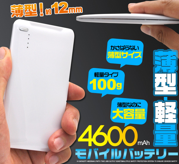 薄型、軽量なのに大容量! 4600mAhコンパクトモバイルバッテリー