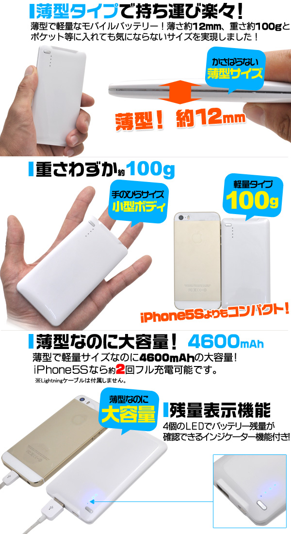 薄型で軽量サイズなのに4600mAhの大容量! iPhone5Sなら約2回フル充電可能です。