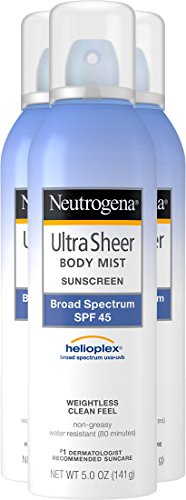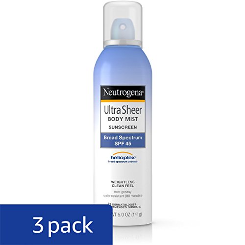 Help protect your skin with Neutrogena Ultra Sheer Body Mist Sunscreen with Broad Spectrum SPF 45. This weightless, sheer mist applies easily, even to hard-to-reach areas, and its one-touch continuous spray works at any angle. This mist is formulated with clinically-proven Helioplex, an advanced suncreen technology with superior broad-spectrum protection from skin-aging UVA rays and skin-burning UVB rays. This sunscreen is water-resistant up to 80 minutes. It is from a dermatologist-recommended brand, oil-free, non-comedogenic, and PABA-free.Feature