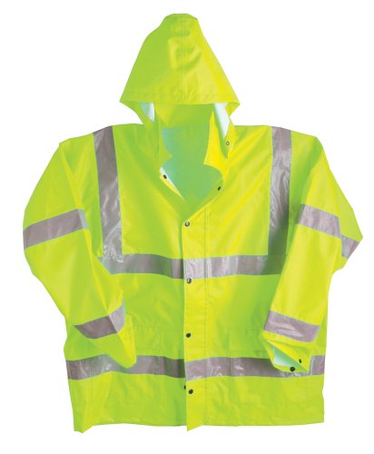 The Kimberly Clark Jackson Safety 20307 ANSI Class 3 polyester ensemble rain jacket has fluorescent yellow-green background material and silver retroreflective trim to distinguish the wearer from the environment for roadway workplace safety. It meets the ANSI/ISEA (American National Standard Institute/International Safety Equipment Association) 107-2004 standard for High-Visibility Safety Apparel and Headwear Class 3 specifications for high-visibility garments. This jacket provides 360 degree visibility with two horizontal retroreflective bands encircling the torso and arms, and it has two vertical trim bands at each shoulder that provide human form definition to help identify workers. This machine-washable polyester outer shell is waterproof to keep the wearer dry in the rain, and has underarm vents for air circulation and cooling. It has two outside front pockets with storm flaps that can be snapped closed, and one inside pocket. Snap closure on sleeve cuffs reduce the space around the wrists to help keep out wind and rain. The hood can be stowed in the collar when not needed.