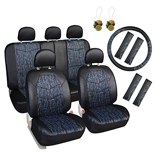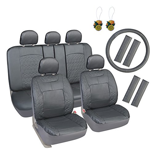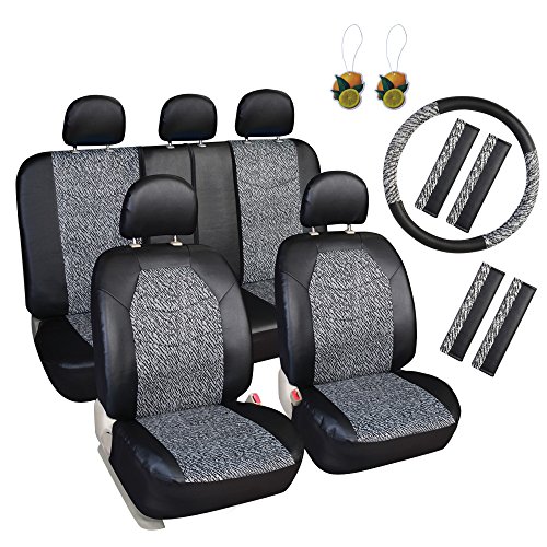 CONTAINS: 17 pieces Car Seat covers set includes 2 of front seat covers, 1 of rear backrest cover, 1 of rear seat cushion, 5 of headrest covers, 1 of universal fit steering wheel cover(14.5-15.5 inch), 4 of shoulder pads, 2 of air fresheners, 1 of cloth mesh.