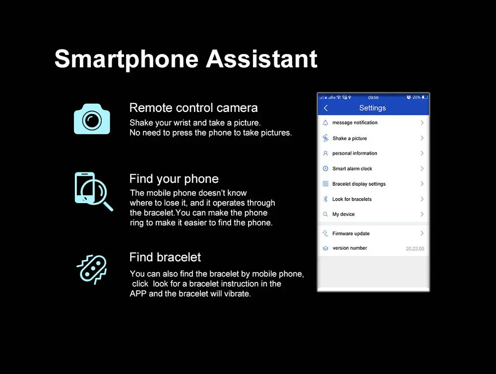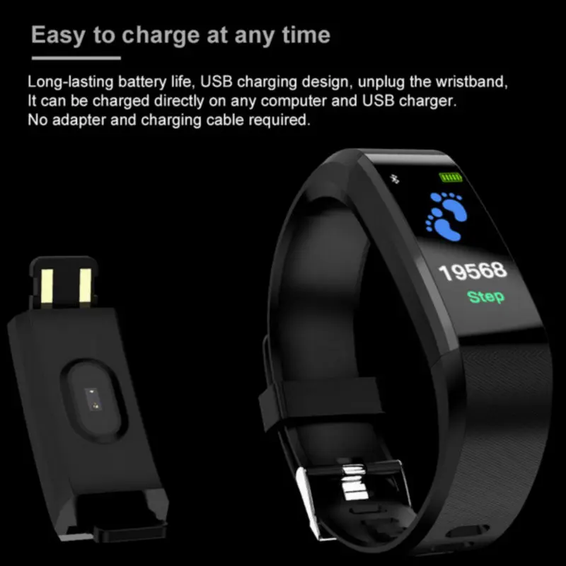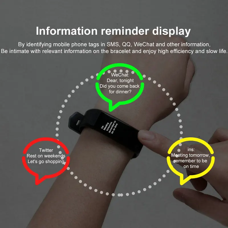 Function:Blood Pressure,Passometer,Sleep Tracker,Push Message,Heart Rate Tracker,Alarm Clock,Remote Control,Social Media Notifications,Message Reminder,Call Reminder