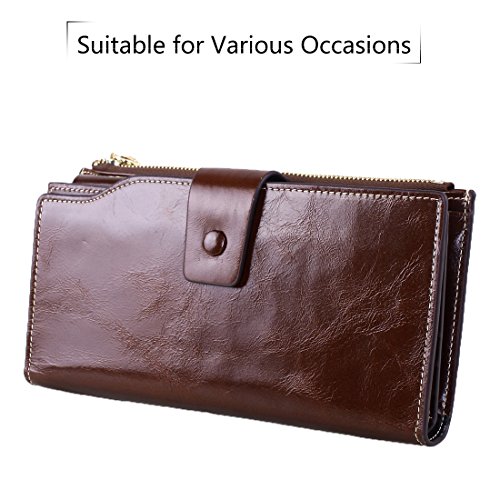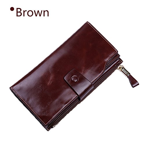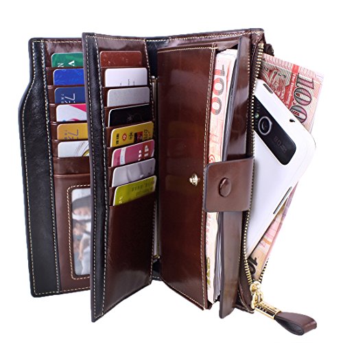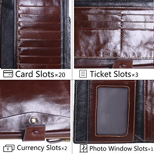 -. Feature : ✔ONE WALLET IS ENOUGH -- HUGE CAPACITY. Multifunctional with 21 card slots(including 1 id window),3 full-length bill compartments,1 snap cash pocket and 1 zipper phone case.Keep your credit cards, cash, coins, notes, receipts,cheekbook and your cell phone well organized.Ultra Practical; / ✔DIMENSIONS--7.56"L x 4.13"W x 1.57"H, It is just the size for a wallet you can simply hold it on hand or put it in bag. / ✔GENUINE LEATHER WALLET-- Oil wax leather has an vintage fashion art effect ,has been the favorite leather type for many luxury brands feels luxury and comfortable. Looks even better after using for a long time. / ✔100%HANDE MADE WALLET--With more than 10 years of experience in the artisans, the best selection of oil Waxed leather parts, handmade / ✔ RFID BLOCKING --THIS IS A SAFE WALLET. Our wallets are equipped with advanced unique proP.R.Ietary blocking material, which blocks RFID signals and protects the valuable P.R.Ivate information stored on RFID chips from unauthorized scans. Tested & Approved by Independent Test Lab.Tested from 10MHz to 3000MHz, including 13.56 MHz in which the credit cards operate.