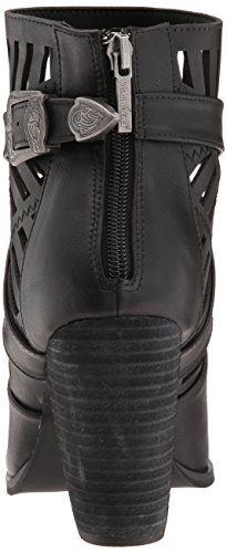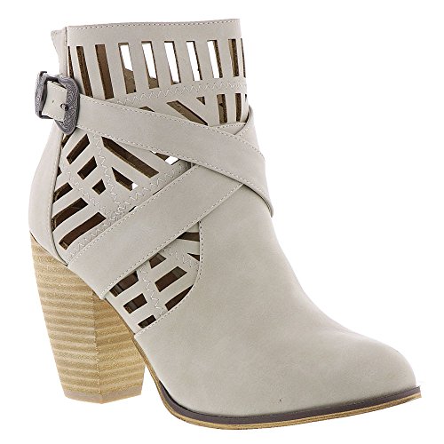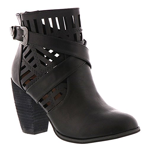 Product DescriptionStacked heel ankle bootie with cut outs and strap detailing0