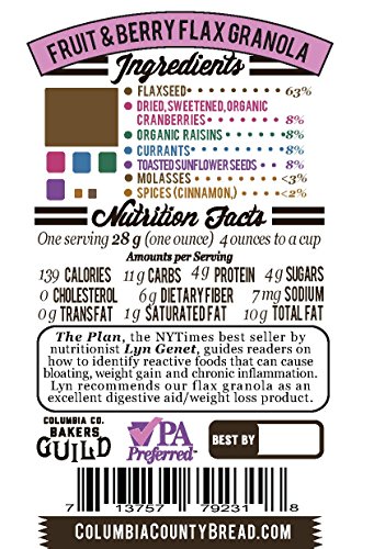 -. Binding : Misc. -. Brand : Columbia County Bread & Granola -. EAN : 0748252037534 -. Feature : Plan Friendly / GMO Free / Gluten Free / Kosher Certified / No Added Salt -. IsAdultProduct : 0 -. Label : Columbia County Bread & Granola -. LegalDisclaimer : This product is nut free and wheat-free but is made in a facility where nuts and wheat are processed. -. Manufacturer : Columbia County Bread & Granola -. PackageQuantity : 1 -. ProductGroup : Grocery -. ProductTypeName : GROCERY -. Publisher : Columbia County Bread & Granola -. Size : 4 x 12 ounce bags -. Studio : Columbia County Bread & Granola -. Title : Fruit and Berry Flax-Granola "The Plan Friendly" Package (4 Pack) by Columbia County Bread & Granola -. UPC : 748252037534