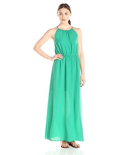 Sleeveless maxi dress featuring gathered halter neckline and elasticized waist