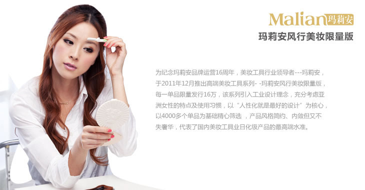 | 为纪念玛莉安品牌运营16周年,美妆工具行业领导者---玛莉安,于2011年12月推出系列高端美妆工具- -玛莉安风行美妆限量版, |