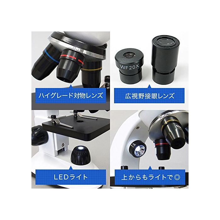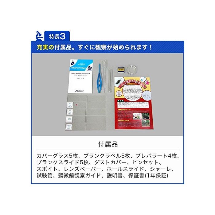 관찰로 필요한 것은 거의 들어가 있습니다 때문에,이 현미경1대로 곧바로 현미경 관찰이 즐길 수 있습니다.커버 글래스5매,blank 라벨5매,Praparat4매,blank 슬라이드5매,더스트 커버,핀셋,spuit,렌즈 페이퍼,홀 슬라이드,《샤레》,시험관,현미경 관찰 가이드,설명서,보증서(1년 보증).【사양】종합 배율:40-800배.조명:백색LED광원(상하2인지(든가) 소)하부 조명:생물 현미경 상부 조명:반사 현미경.사이즈:폭 120 X 횡165 X 높이290mm .무게:690g.단3건전지3개 사용(별매)