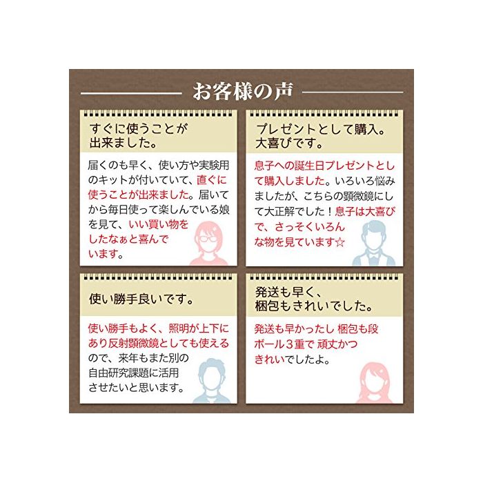 신뢰 어느(있는) 공장에서 직접 수입하고, 국내의 현미경 공장에서 숙련 직공(직인)가 1대 1대 검사 조정해 높은 품질을 유지하고 있습니다.하이 그레이드 대물 렌즈와광 시야 접안렌즈,백색LED라이트의 편성으로,수차가 적게 샤프하고 자연스러운 색의 상이 얻을 수 있습니다.초등학생에게서 어른까지 폭넓게 이용 하실 수 있는.※메이커에 의한 1년간 보증이 붙어 있으므로만이 1의 시도 안심입니다.