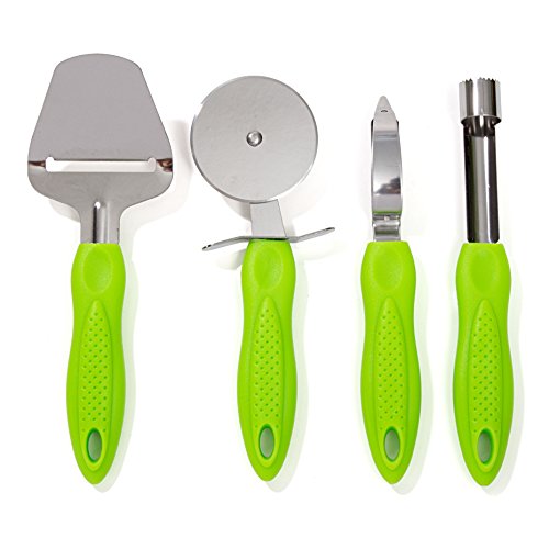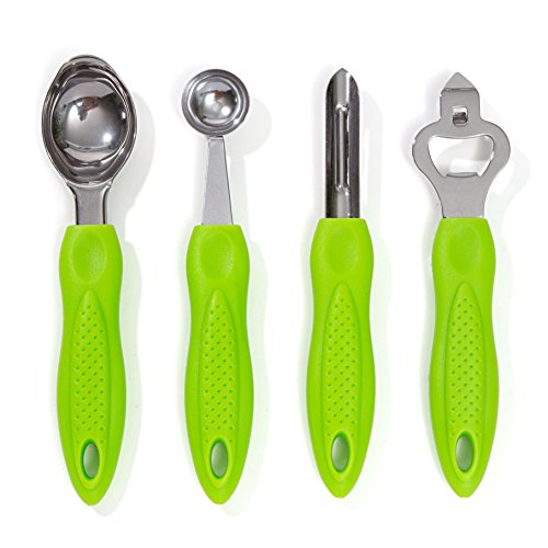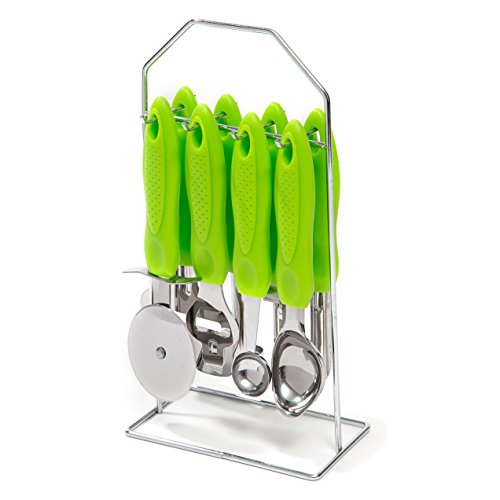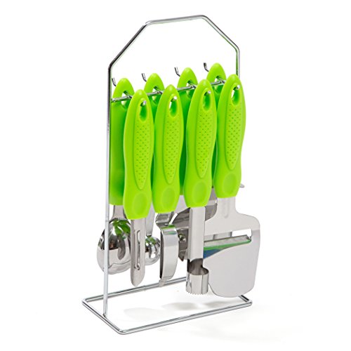 -. Title : HULLR 9-Piece Stainless Steel Kitchen Gadgets Tools Set, Pizza Cutter, Can Opener, Peeler, Ice Cream Scoop, Melon Baller, Corer, Swivel Peeler, Cheese Shaver with Metal Stand