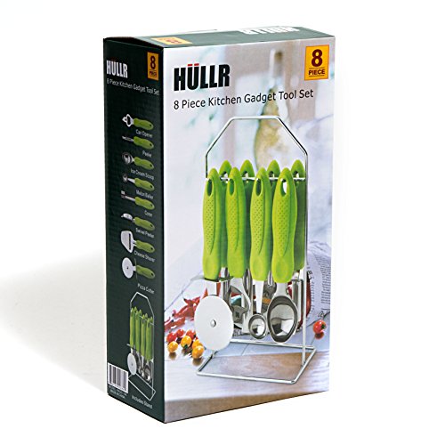 -. Feature : HULLR 9-Piece Stainless Steel Kitchen Gadget Tool Set Includes: Pizza Cutter, Can Opener, Peeler, Ice Cream Scoop, Melon Baller, Corer, Swivel Peeler, Cheese Shaver & Metal Stand / Ergonomic Handles For Comfortable Use / All Gadgets Store Safely In Metal Stand For Space Efficient Storage / HULLR Premium German Design & Innovation