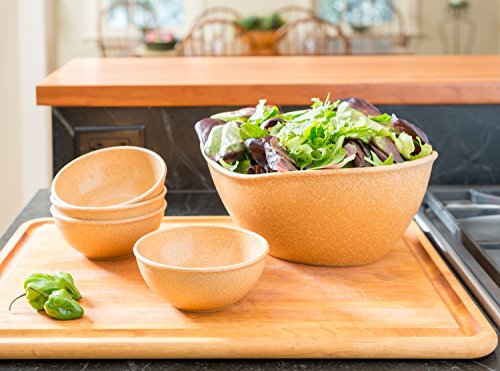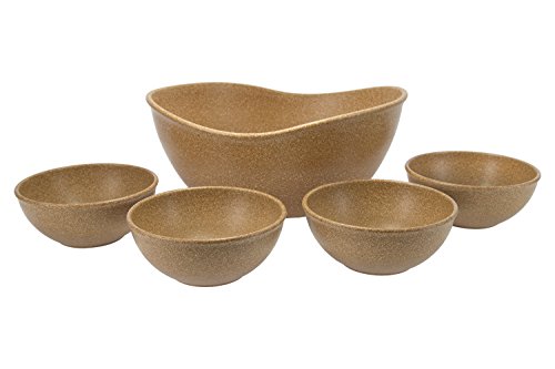 This set of wpc (wood plastic composite) bowls are a sustainable and innovative way to serve friends and family. Contains one large, deep, and versatile serving bowl, great for salads, and four durable individual 16oz bowls. As always, the BPA free products are dishwasher and microwave safe.Feature