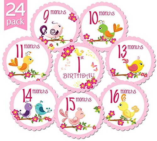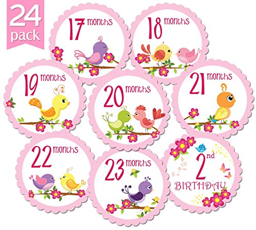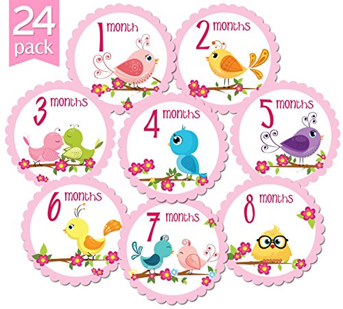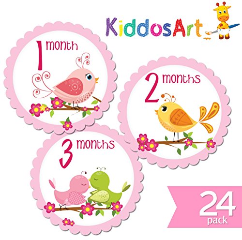 24 Pack of 4" Premium Baby Monthly Stickers By KiddosArt. 1 Sweet Bird Sticker Per Month of Your Baby's First 2 Years Growth. Month Pink Sticker for Baby...